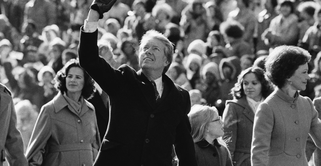 photo: President Jimmy Carter waves to the crowd while walking with his wife Rosalynn and their daughter Amy along Pennsylvania Avenue from the Capitol to the White House following his inauguration, Jan. 20, 1977, in Washington. (AP Photo/Suzanne Vlamis, File)